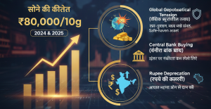 2024 और 2025 में हमने देखा कि भारत में सोने के दाम ₹80,000 प्रति 10 ग्राम के पार चले गए। इसके मुख्य कारण निम्नलिखित हैं: